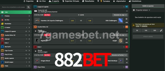 O 882Bet oferece uma grande seleção de opções de apostas em e-sports com probabilidades competitivas